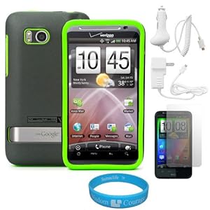 Protect and personalize your Verizon Wireless HTC Thunderbolt 4G Android Smartphone with this Durable Hard Back Cover and its SoftTouch Silicone Skin. Elegant form-fitting design hard shell back cover. Three layers for maximum protection (Hard Case + Skin + Screen Protector).Protects your phone without adding a lot of bulk. Provides Maximum protection against unnecessary scratches and scuffs. Form-fitting case cover that still allows access cell phone's all function. A Screen Protector film is included for HTC Thunderbolt 4G. Package also includes a Travel/Home charger is lightweight and easy to carry while traveling. An Intelligent IC chip inside recognizes a fully charged battery and automatically switches to a saver mode to prevent overcharging and short circuit. Package also includes a Car Charger Cigarette Lighter Adapter suitable allows charging your Smartphone and unlimited playing time while in the car. Enhanced internal circuitry to manage charging status and prevent over- and under-charging. Integrated electrical fuse to prevent damage to phone or battery. INCLUDES! SumacLife TM Wisdom Courage Wristband
