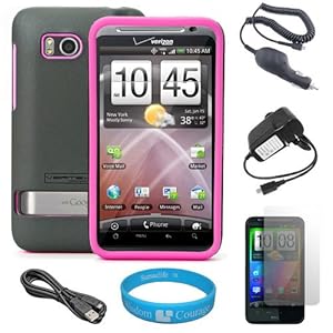 (Grey & Hot Pink) Vertex Duo Protector Case with Screen Protector for Verizon Wireless HTC Thunderbolt 4G Android Smartphone + Black Micro USB Car Charger + Black Micro USB Home Charger + Black Micro USB Data Cable + SumacLife TM WisdomCourage Wristband