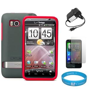 (Grey & Red) Vertex Duo Protector Case with Screen Protector for Verizon Wireless HTC Thunderbolt 4G Android Smartphone + Black Micro USB Home Charger + SumacLife TM WisdomCourage Wristband