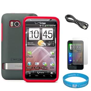 (Grey & Red) Vertex Duo Protector Case with Screen Protector for Verizon Wireless HTC Thunderbolt 4G Android Smartphone + Black Micro USB Data Cable + SumacLife TM WisdomCourage Wristband