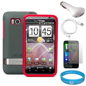 (Grey & Red) Vertex Duo Protector Case with Screen Protector for Verizon Wireless HTC Thunderbolt 4G Android Smartphone + White USB Car Charger + White Micro USB Data Cable + SumacLife TM WisdomCourage Wristband