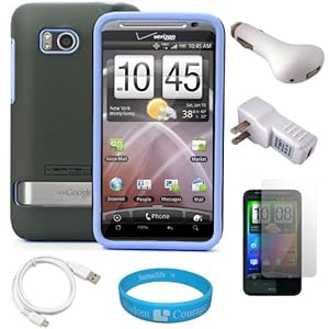 (Grey & Sky Blue) Vertex Duo Protector Case with Screen Protector for Verizon Wireless HTC Thunderbolt 4G Android Smartphone + White USB Car Charger + White USB Home Charger + WHITE USB DATA CABLE + SumacLife TM WisdomCourage Wristband