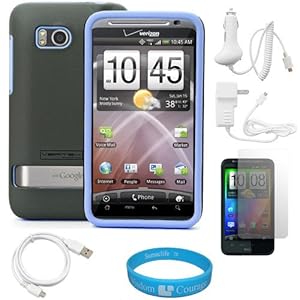 (Grey & Sky Blue) Vertex Duo Protector Case with Screen Protector for Verizon Wireless HTC Thunderbolt 4G Android Smartphone + White Micro USB Car Charger + White Micro USB Home Charger + White Micro USB Data Cable + SumacLife TM WisdomCourage Wristband