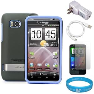 (Grey & Sky Blue) Vertex Duo Protector Case with Screen Protector for Verizon Wireless HTC Thunderbolt 4G Android Smartphone + White USB Home Charger + White Micro USB Data Cable + SumacLife TM WisdomCourage Wristband