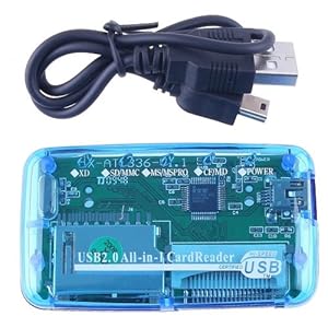 Mini All-in-1 Memory Card Reader (Blue or Black Color) Compatible with: Secure Digital: miniSD (with adapter), microSD/TransFlash (with adapter), Compact Flash: CF I, CF II, CF Ultra II, MicroDrive, xD Picture Cards, Memory Stick: Memory Stick, Memory Stick Pro, Memory Stick Duo, Multimedia Card: MMC I, MMC II, RS-MMC, HS-MMC - Compatible with Sony, SanDisk, Toshiba, Lexar